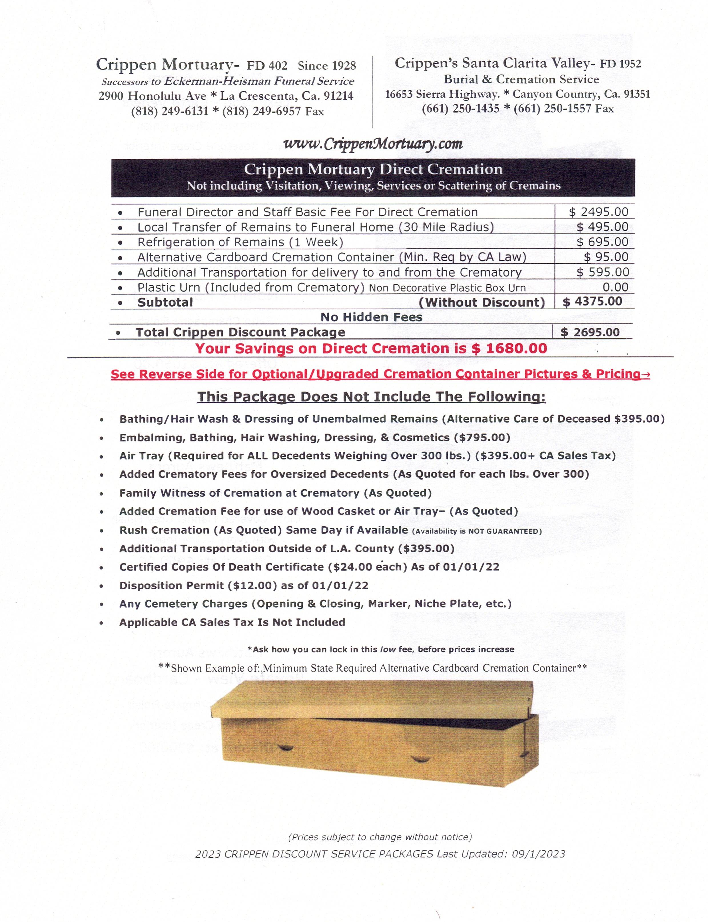•  Affordable $2695.00 Direct Cremation Service   *** Save Over $1,000.00   Vs.  Other Local Funeral Homes ***